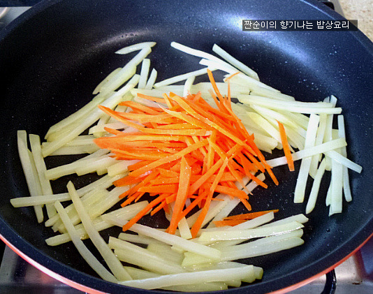 감자채가 반정도 익으면 썰어둔 당근채를 넣어주고 소금살짝 넣어 볶아줍니다