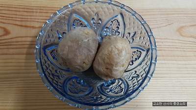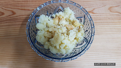 ㉢ 구운 감자는 껍질을 벗겨 숟가락으로 으깨준다.(전자레인지를 이용해도 됩니다.)