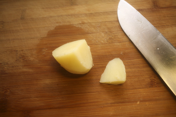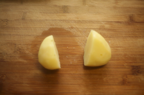 찜통에 찐 감자를 반을 가르고
