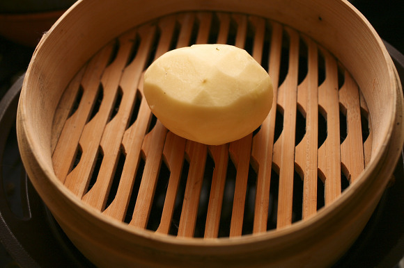 껍질을 벗긴 감자를 찜통에 올려주고