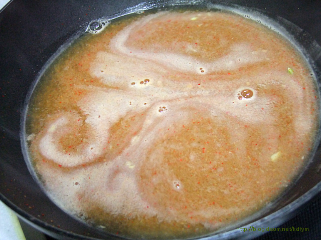 깊은 후라이팬에 물 2컵반. 된장 3큰술. 후추 조금. 고춧가루 1작은술. 다진마늘 1큰술을