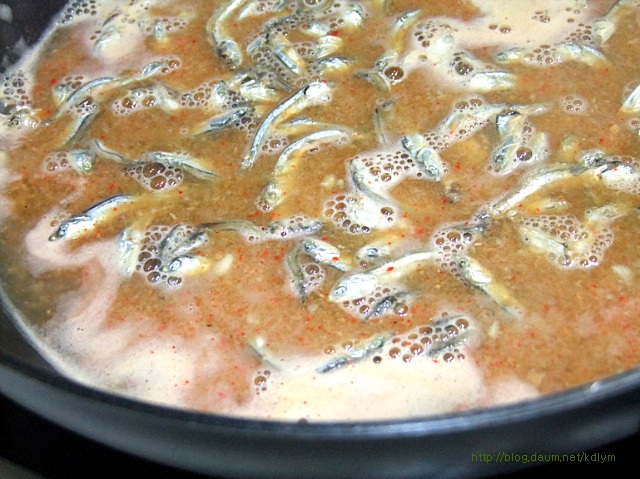된장물을 끓이는 도중에 멸치를 한웅큼 넣어줍니다.