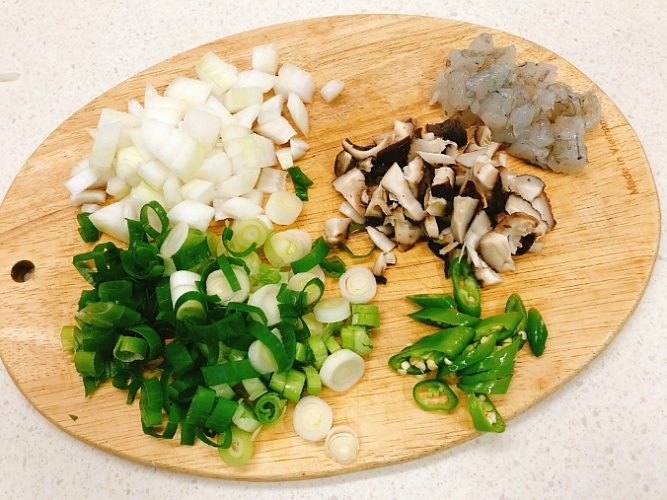 새운 식감있게 썰고, 불린 표고버섯은 물기짜서다지듯 썰어줍니다