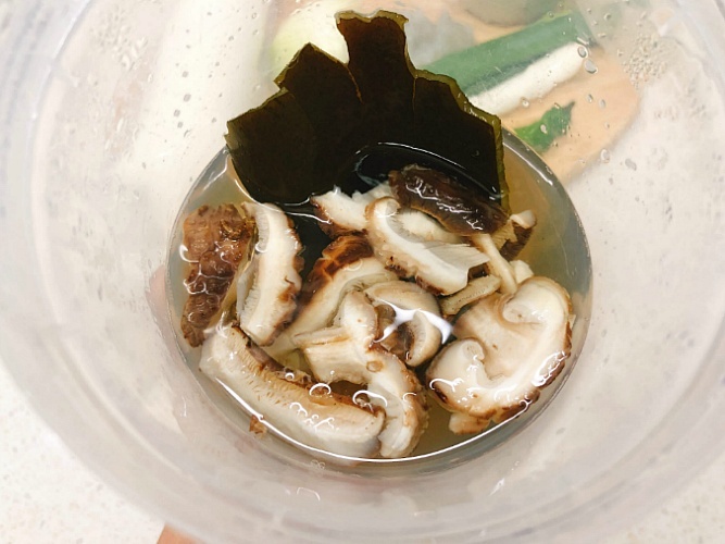 미지근한물 450㎖+ 다시마 8×8 1장 + 말린표고버섯 1.5개정도