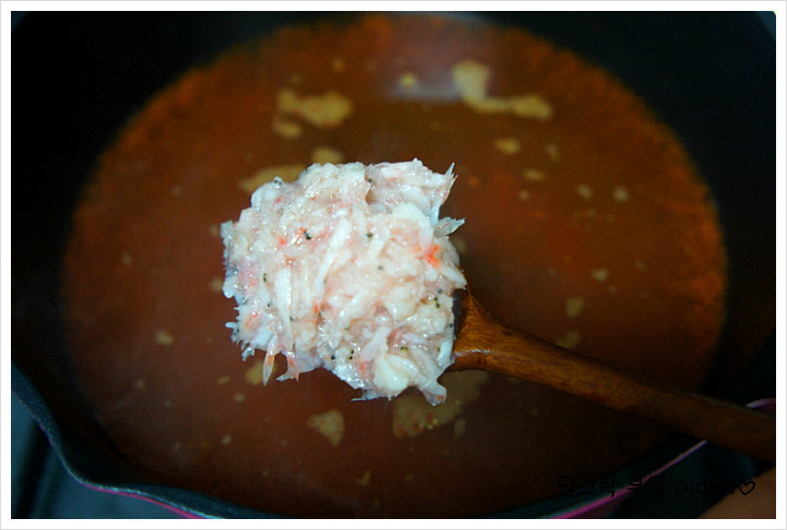 건더기는 건져낸 다음, 다진마늘 1, 고춧가루 1, 국간장 1, 새우젓 1 스푼 정도로 간을 맞춰 주어요.