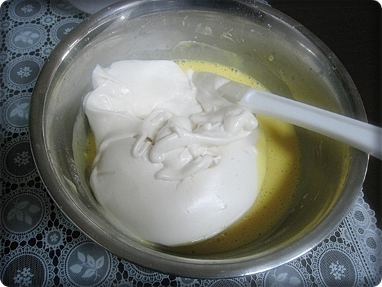 반죽에 머랭을 넣고 아래에서 위로 들어올리 듯이 섞어준다.