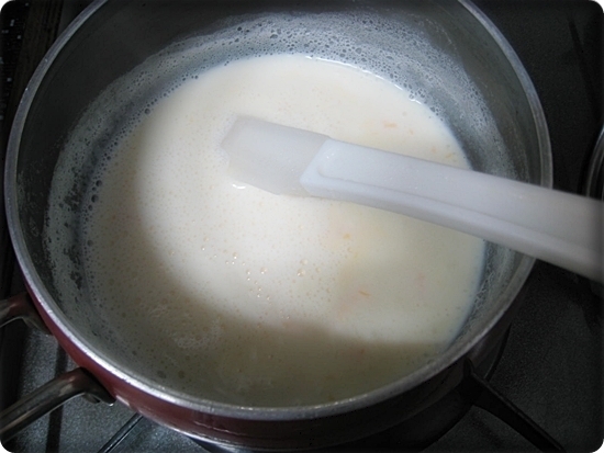 냄비에 우유 220㎖를 끓이면서 치즈를 잘라서 넣어가며 치즈를 녹인다.