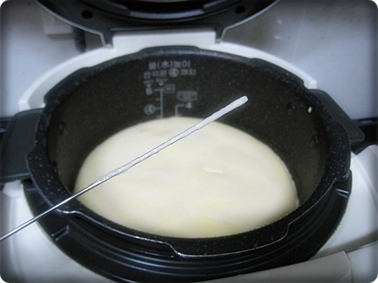 취사가 끝난 후 꼬치 테스트를 하니 아직 반죽이 묻어나옵니다.