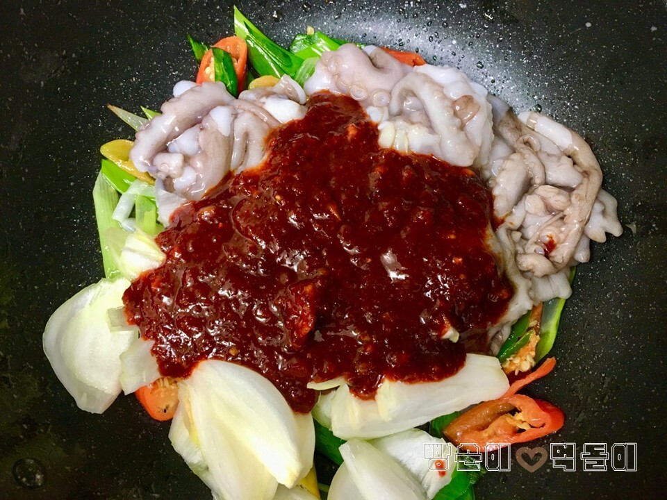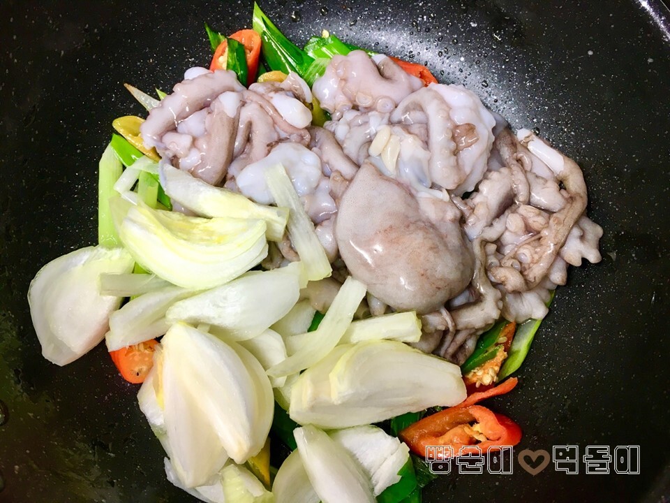 ▲ 대파, 고추기름을 확실히 내고난 후, 낙지와 양파를 올리고, 위에 다시 양념장을 올린 후, 볶아줍니다~!