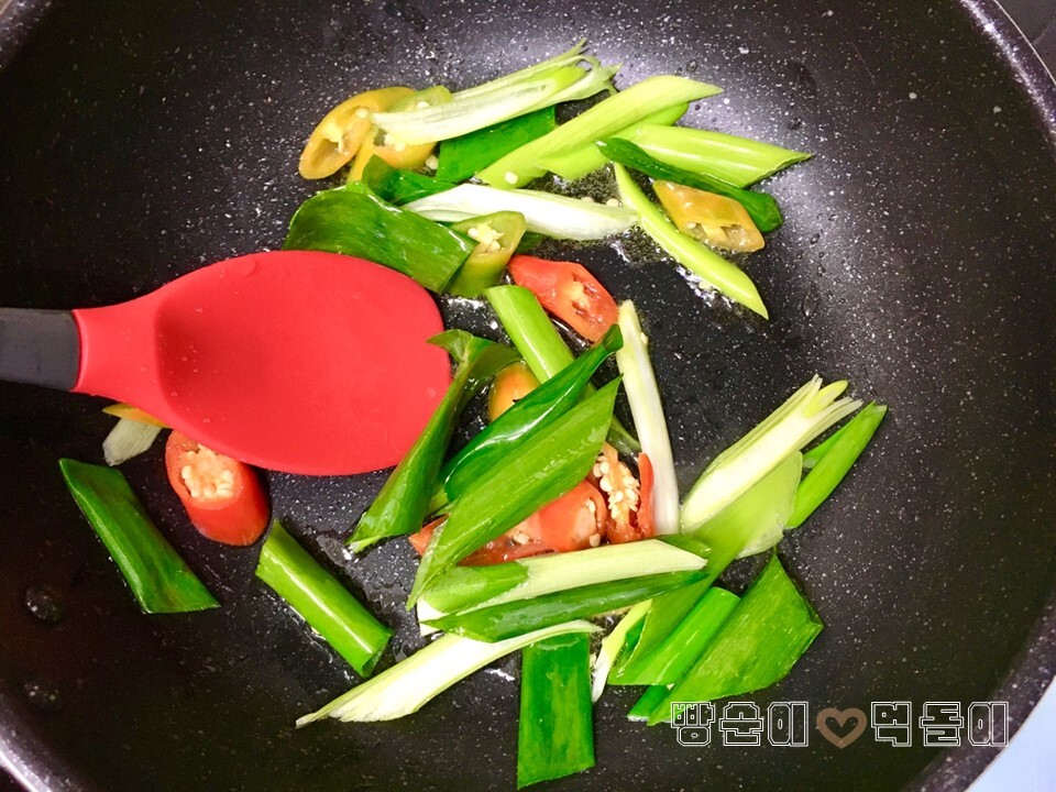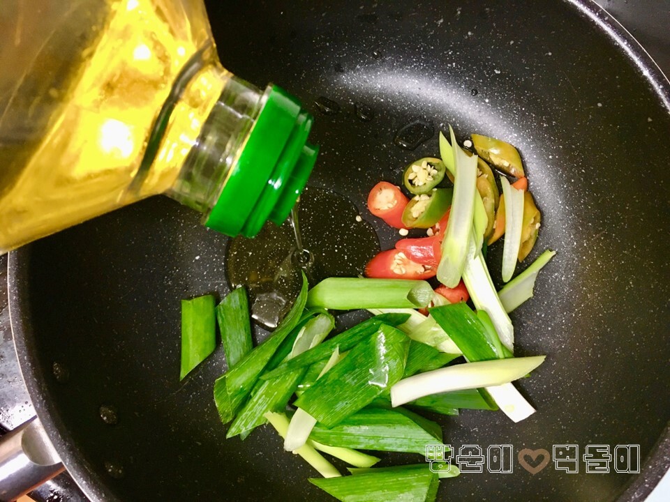 ▲ 대파와 청양고추를 넣고 식용유를 적당히 두르고서 볶아줍니다.