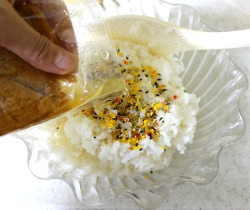 6) 한 김 식은 밥에 초밥에 들어있던 소스를 넣고 그다음 유부에 들어있던