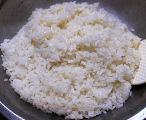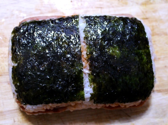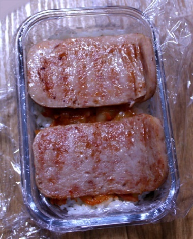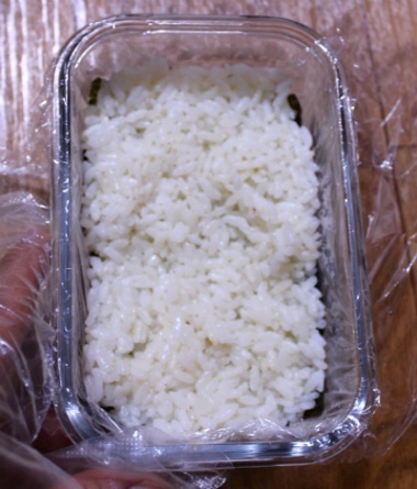 8) 스팸 위에 밥을 얇게 펴서 덮어주세요.