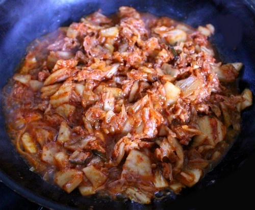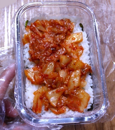 6) 밥 위에 볶아둔 김치를 올려주세요.