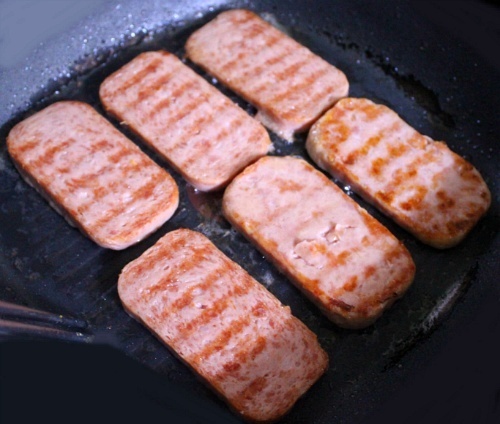 1) 스팸 종류의 햄을 썰어 앞뒤로 노릇하게 구워줍니다.