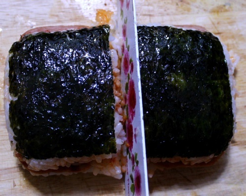 12) 그리고 밥 버거 가운데를 칼로 잘라주세요.