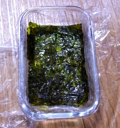 4) 반찬 통에 랩을 깔고 조미김을 위아래 두 장 펼쳐주세요.