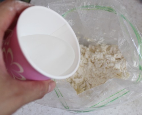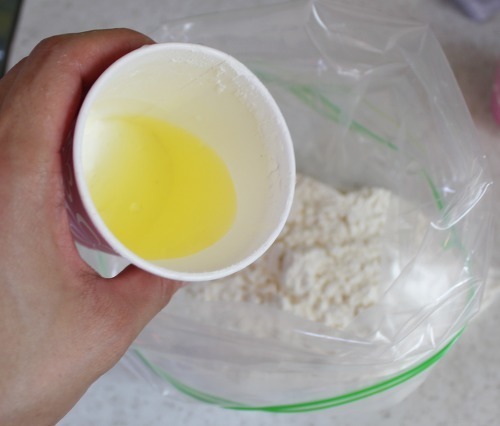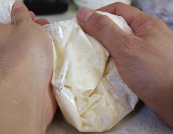 5) 지퍼백의 주둥이를 왼손으로 잡고 오른손으로는 달걀물과 밀가루가 섞이도록 조물조물해 주세요.