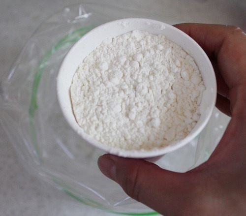3) 밀가루 2컵을 (종이컵) 큰 지퍼백에 담아주세요.