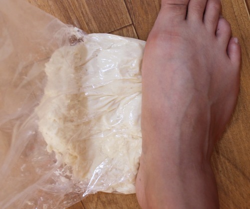9) 손이나 발로 조물조물 반죽해 주세요.