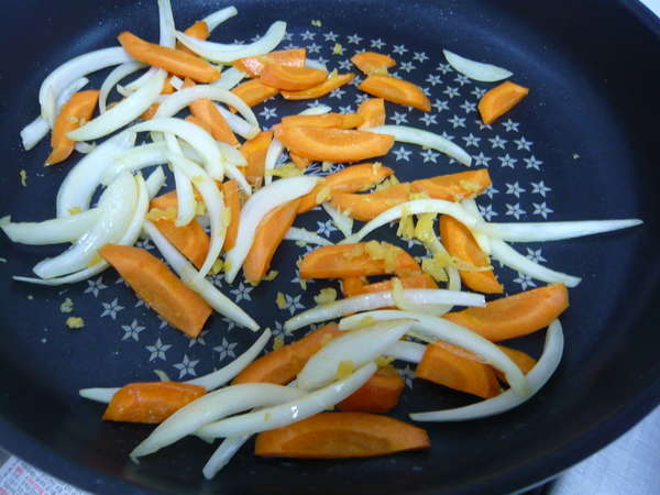 팬에 오일을 두른 후 단단한 당근부터 볶다가 양파를 넣고 투명하게 볶아주세요.
