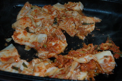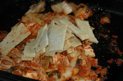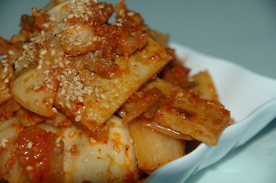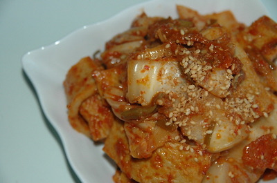 식용유 두른 팬에 김치를 달달 볶다가(이 때 부터 나는 기 막힌 냄새에 정신이 혼미해지지요. ^^) 데쳐낸 어묵을 넣고 잠깐 더 볶아서(고추장을 약간 넣어도 되요) 깨소금 뿌려 마무리.