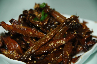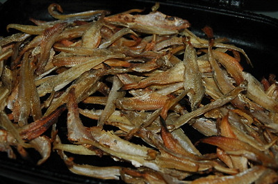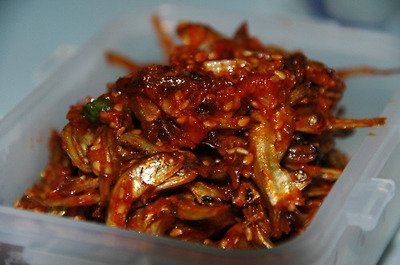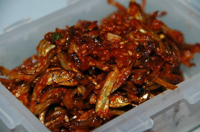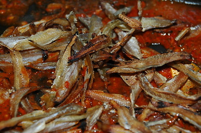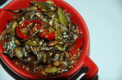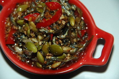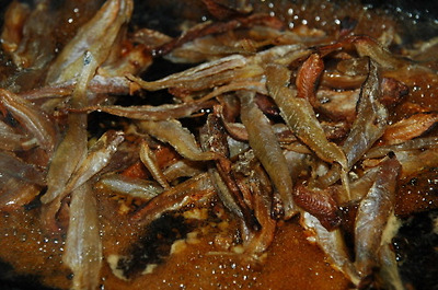깨소금을 제외한 고추장 조림 양념을 바글바글 끓이다가 볶아 놓은 멸치를 넣고 양념이 배이도록 약불에서 골고루 뒤집다가 물엿 약간과 깨소금을 뿌려 마무리.