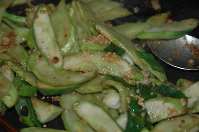 반달 썰거나 굵게 채 썰어서 기름 두른 팬에서 달달 볶다가 호박이 군데 군데 투명하게 변하면 새우젓과 마늘, 파, 호박이 자박하게 잠길 만큼의 생수를 붓고 잠깐만 끓여요. 호박이 약간 살캉하게 씹히는 것도 맛있습니다. 깨소금 뿌려 마무리.