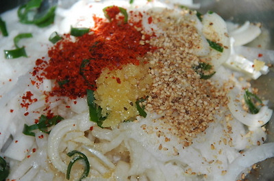 5. 흔하디 흔한 반찬이지만, 참 맛 좋은 무 생채. 재료; 무, 소금, 고춧가루, 설탕, 파, 마늘, 까나리액젓, 깨소금