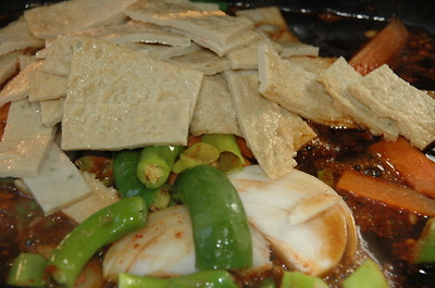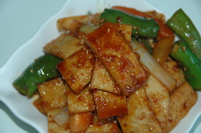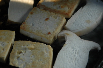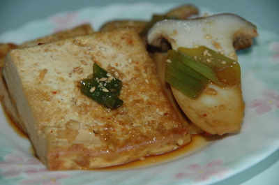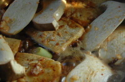 두부를 먼저 기름에 굽다가 새송이를 넣고 잠깐 더 구은후, 조림장을 넣고 조려 줍니다.