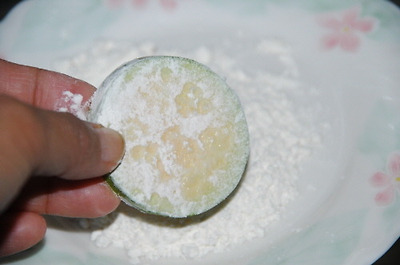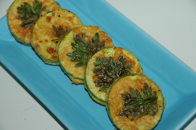 동글 썰기를 해서 소금 약간을 솔솔 뿌려 잠시 두고, 맛술 넣은 달걀(식은 후에 비린내가 덜 나는 것 같아요)에 소금 약간 넣어 풀어 놓아요. 밀가루 - 달걀 순으로 입혀서 팬에서 노릇하게 익혀 냅니다. 쑥갓으로 멋 좀 부려 봤어요. ^^