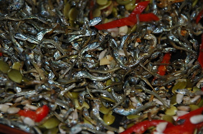 2. 멸치 볶음 3가지. 재료; 멸치, 과자같은 멸치 볶음(마늘, 설탕, 물엿, 깨소금), 고추장 멸치 조림(고추장과 생수 반씩, 설탕, 물엿, 버섯가루, 마늘, 깨소금), 올리고당에 빠진 멸치 볶음(마늘, 설탕, 올리고당 넉넉히, 깨소금, 견과류) 기름 두르지 않은 팬에 멸치를 노릇하게 볶는 건 공통입니다.