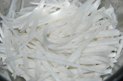 채 썰은 무에 소금 약간 뿌려 30여분 절인 후 꼭 짜서 양념을 넣어 골고루 무치기만 하면 끄읕~~