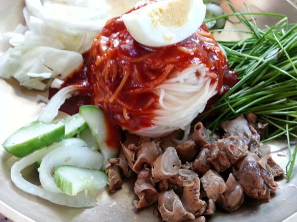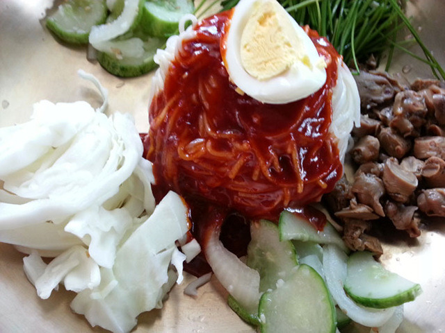 11)개인 그릇에 있는 재료들을 담아서 국수를 얹어 주고 초고추장 뿌려 주고