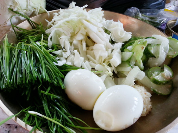 영양부추, 양배추, 채소를 다듬고 채쓰는 사이 계란은 얼른 삶아서 껍질 벗기고