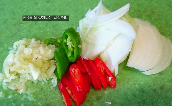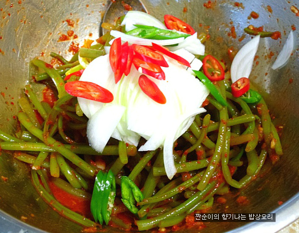 마무리에 양파와 매운홍고추 그리고 풋고추를 넣어 살짝 버무려주면 되어요