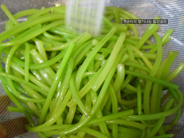 데쳐지면 찬물에 샤워시켜주어요