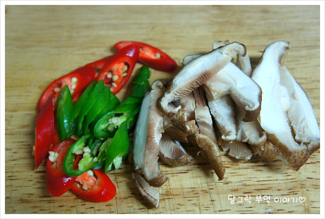 삶은 달걀, 표고버섯, 홍고추, 청양고추, 파 조금씩.