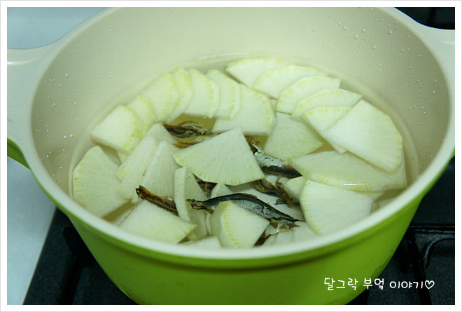 냄비에 물을 넣고 무와 머리, 내장을 제거한 멸치를 넣고 끓이다가