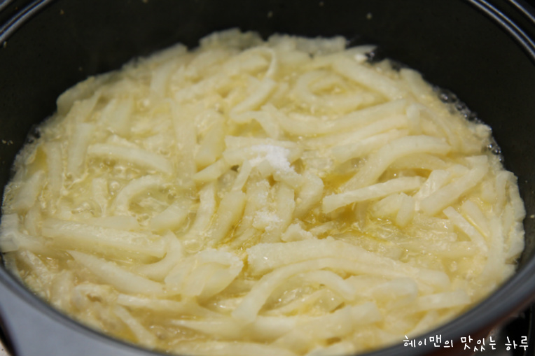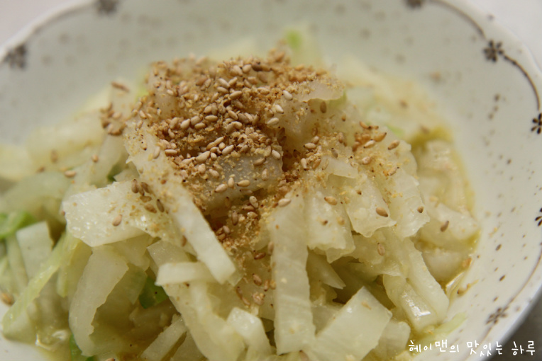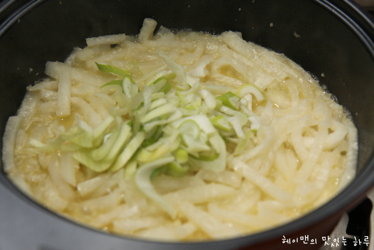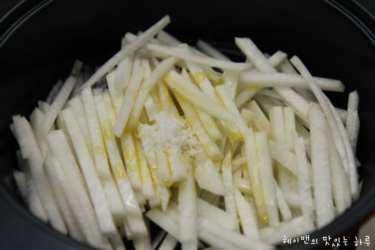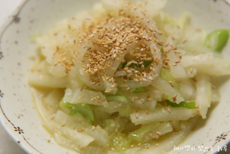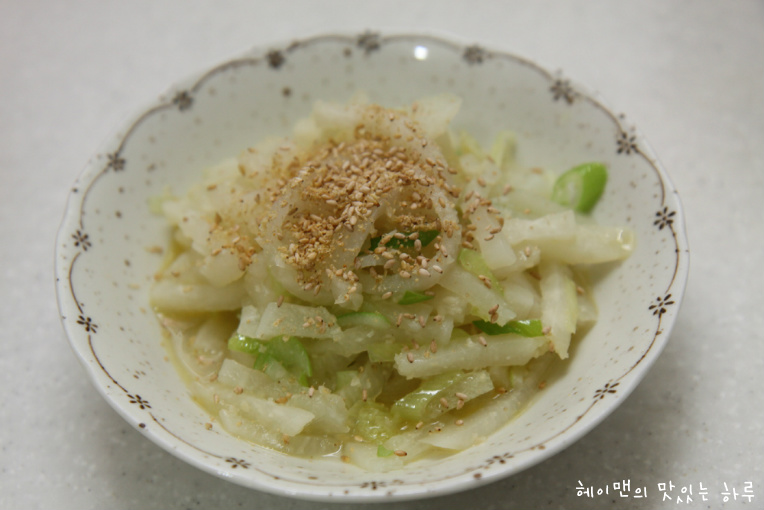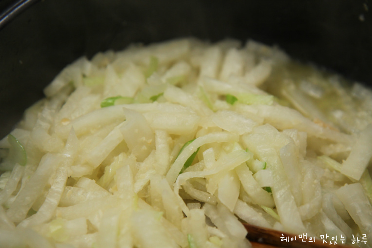 무 반개, 물한컵, 들기름 2T, 소금, 다진마늘 1T, 대파 반개