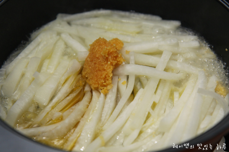 2. 채썬 무와 물반컵, 소금 1t, 들기름 1T를 넣고 뚜껑을 덮은 후 끓여주세요~