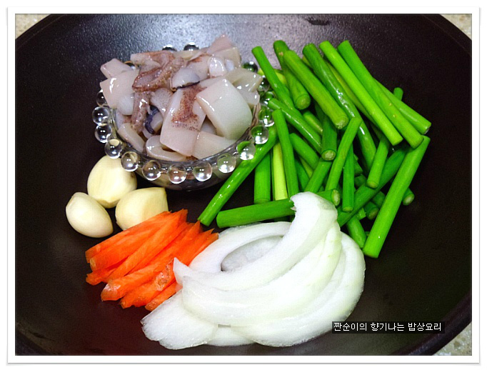 재료:마늘쫑약간,오징어반마리정도,마늘3개,당근채약간,양파채약간,포도씨유