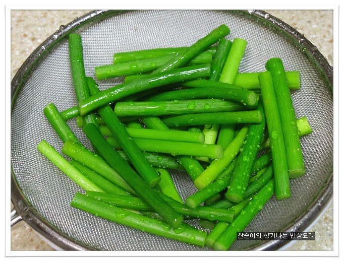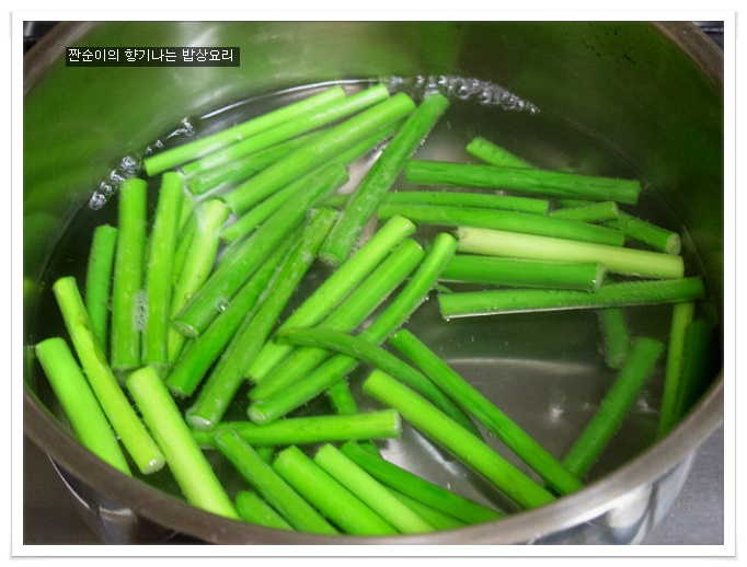 마늘쫑은 소금넣은 끓은물에 살짝 데쳐내구요