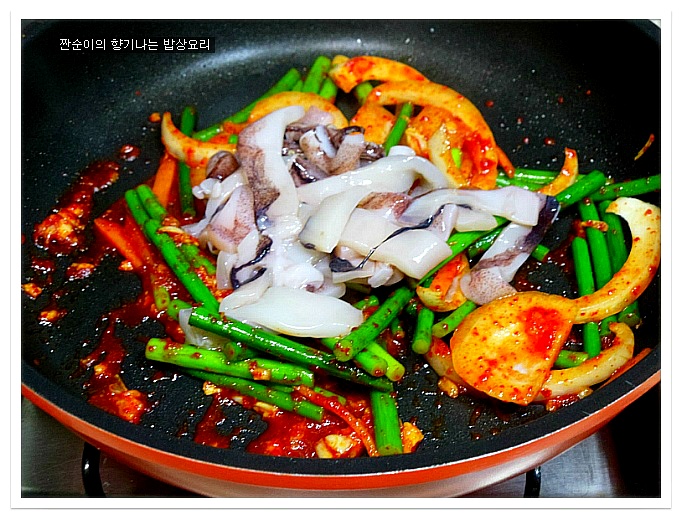 마지막쯤에 오징어를 넣어 볶아주는데요 오징어는 금방 익으니 살짝 부드럽게만 볶아요~~