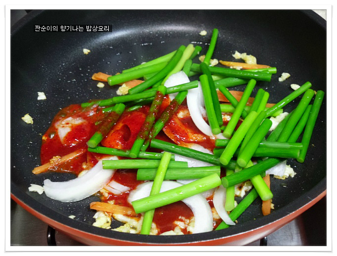 마늘향이 나면 여기에 살짝 데쳐 헹구어둔 마늘쫑과 양파를 넣어주고
