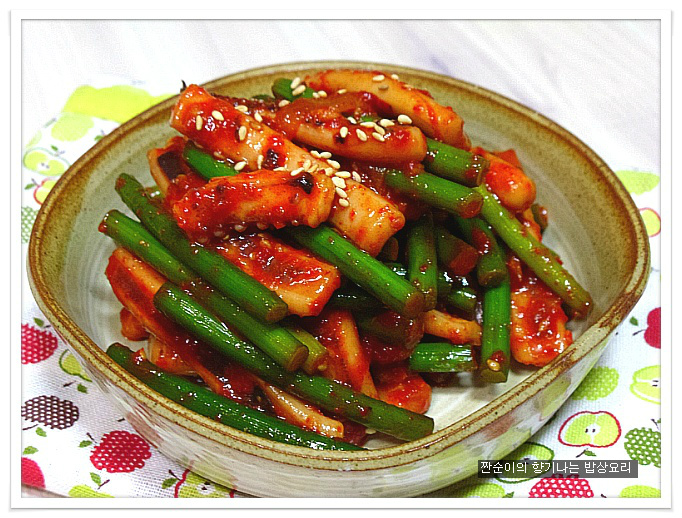 오늘은 마늘쫑과 오징어를 매콤하게 볶았어요