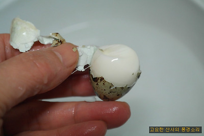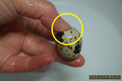 ㉢ 메추리알은 뾰족한 부분(아래쪽), 둥근 부분(위쪽)이 있는데, 위쪽 부분에 숨구멍이 있어 살짝 눌려준다.