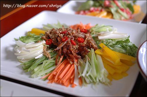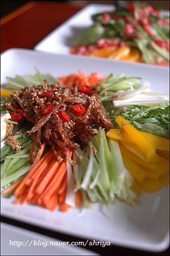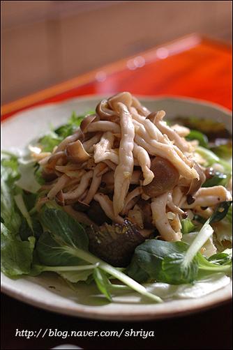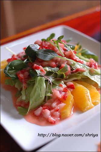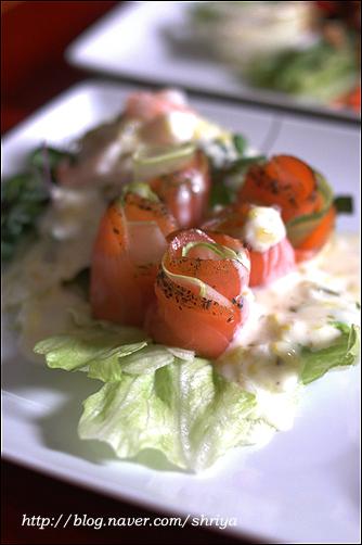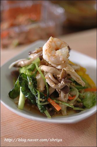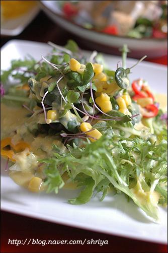 샐러드하면 어렵게 생각하지만,요령만 알고 하면 정말 쉽게 아주 무한하고 다양하게 만들 수 있는 것이 샐러드예요..누구나 아삭한 맛에 좋아하는 양상추를 기본으로 하고, 여기에 어린잎 채소(베이비 채소)와 새싹채소를 주로 같이 사용하고요... (새싹채소는 비타민과 미네랄, 단백질이 다 자란 채소보다 무려 20배나 많고, 농약을 사용하지 않아 영양덩어리라 하지 않을 수 없다. 이렇게 기본이 되는 채소 위에 과일을 더하면 과일샐러드, 연어를 좋아하는 사람은 연어를 올리면 연어샐러드....치킨을 올리면 치킨샐러드, 새우를 올리면 새우샐러드, 그밖에 두부샐러드나 버섯 샐러드.... 견과류를 올려도 좋고, 콘프레이크나 씨리얼 등을 올려도 좋고...뭐 넣을 수 있는 재료들도 엄청 무한하다라는 거... 그리고 드레싱도 마찬가지... 마요네즈를 좋아하면 마요네즈가 기본이 되는 드레싱을 만들면 되지만, 요새는 대신 할 수 있는 플레인 요구르트를 많이들 사용하기도 하고, 계절 과일도 좋은 드레싱의 재료가 되고, 또 우리나라 간장도 정말 좋은 드레싱 재료중 하나고, 담백하고 칼로리가 적은 것이 큰 장점 중에 장점이 될 수 있고요...또 건강을 생각하는 사람들이 올리브오일이나 발사믹식초, 와인 식초 등을 이용해서 새콤한 맛의 드레싱을 만들어 드시기도 하고....유자청, 매실청, 또 캔에 든 옥수수까지....드레싱을 만들 수 있는 재료들도 실로 무한하답니다... 이 기본 재료들에 저는 샐러드가 가지는 기본 특징인 새콤하면서 달콤한 맛에 충실하려고 설탕과 식초, 그리고 간을 위한 소금의 양을 적절히 배합을 해서 드레싱을 만들어 먹고 있어요.... 모든 계량 기준은 종이컵과 밥숟가락으로 했어요...입맛에 맞게 조금씩 양념을 가감해서 드시고요...  연어와 새우를 넣은 샐러드... 양상추와 기본이 되는 채소들에...필러로 얇게 저민 오이와 연어를 돌돌 말고, 손질한 새우는 소금물에 데치고...드레싱은 요구르트를 이용한 드레싱인데요...전에도 여러번 올렸던 거라서... 플레인 요구르트(1통-100g), 마요네즈(2), 다진 오이피클(2), 다진 양파(2), 레몬즙(1), 꿀(0.5), 소금, 후춧가루(적당량) 연어 안에 무순을 넣고 돌돌 말면 더욱 예쁘답니다... 쥐포 샐러드... 재료도 간단하면서 늘 먹는 쥐포를 색다르게 먹을 수 있는 메뉴랍니다...드레싱도 의외로 간단... 쥐포 샐러드는 양상추, 당근, 대파 흰 부분, 오이, 피망 등의 야채를 가늘게 채 썰고....쥐포는 기름 자작하게 붓고 튀기고, 한김 나가고 나면 바로 가위를 이용해서 잘라 줍니다..위에 끼얹은 드레싱은... 감자들깨 드레싱... 간장(2), 식초(3), 레몬즙(1), 설탕(1), 물엿이나 꿀(1), 참기름(0.3), 깨소금(2), 소금, 후춧가루(적당량) 책에 나온 레서피 양보다 식초를 한숟갈 정도 줄였어요..시고 달기는 입맛에 맞게 조절하시고요...간을 보아서 나중에 소금, 후추 살짝 넣어서 간을 해주시면 된답니다...재료들 쭈욱 올리고 먹기 직전에 드레싱 뿌리고 모든 재료들 양장피 섞듯이 섞어서 드시면 되지요....