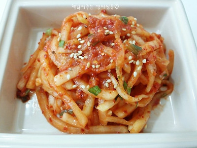 재료: 무 1/2개, 천일염 1큰술, 고추가루 4~5큰술, 멸치액젖 2큰술, 식초 1~2큰술,