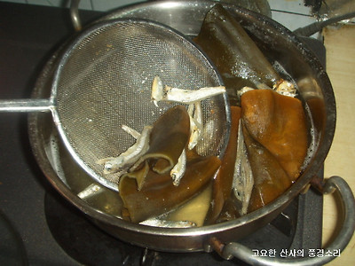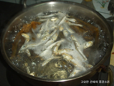 ▶ 맛이 우러나면 다시마와 멸치는 건져 버립니다.