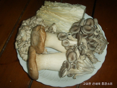 재료: 표송이버섯 2개, 팽이버섯 1봉, 잎새버섯, 느타리 버섯 약간, 양파 반개,